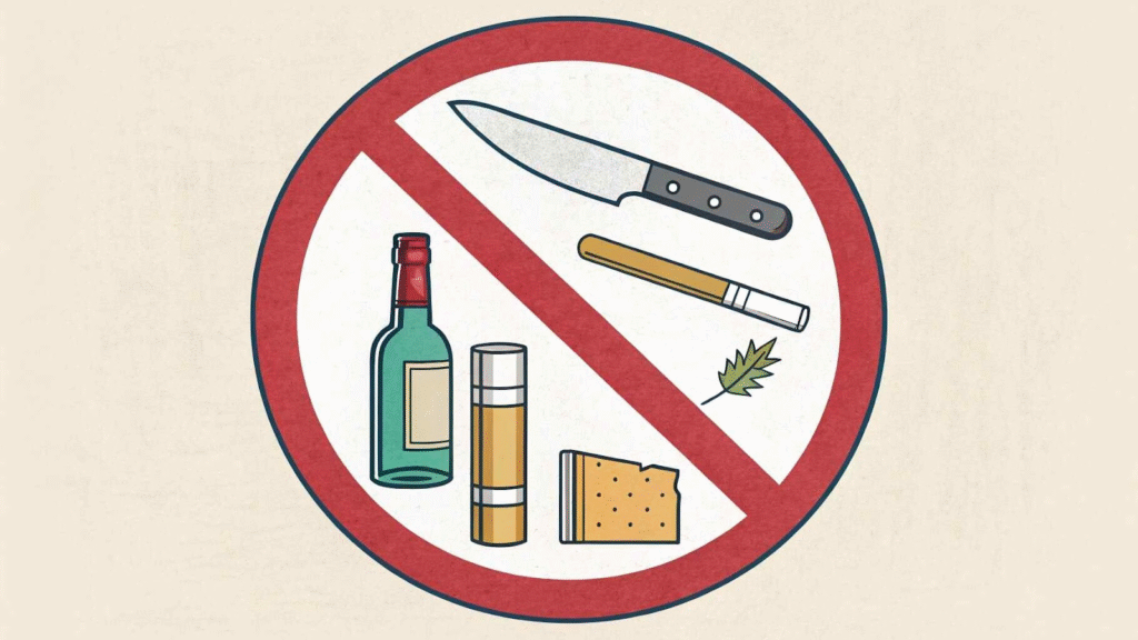 Some items are complete no-gos: drugs, liquor of high alcohol content, unlicensed weapons, wireless communication equipment without permits, and beef products (except for five-star hotels with special licenses).
